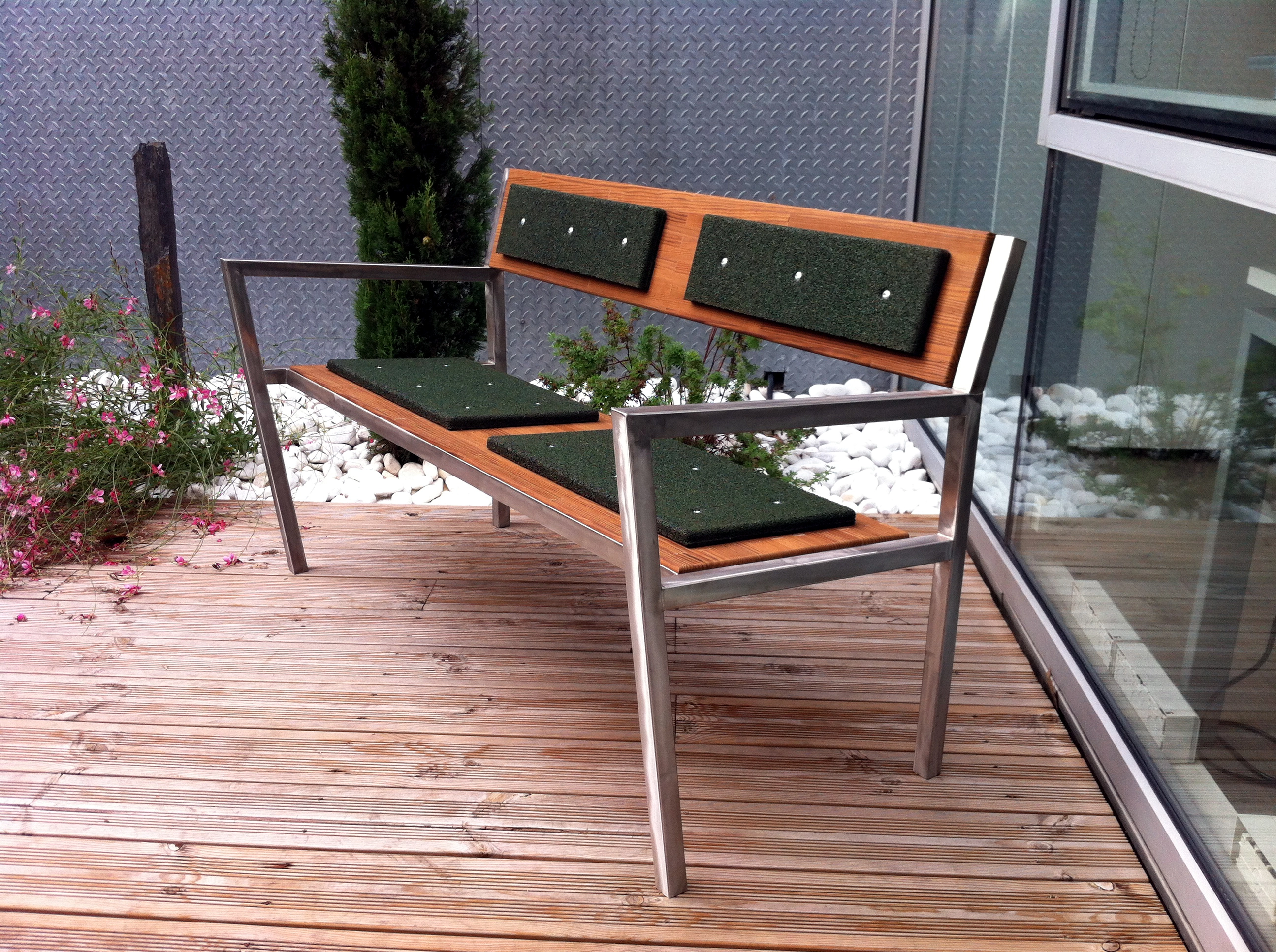 Utilisation de chutes de bois de bardages et caoutchoucs recyclés sur une armature en inox, apportant confort, finesse et élégance au monde des bancs publics.